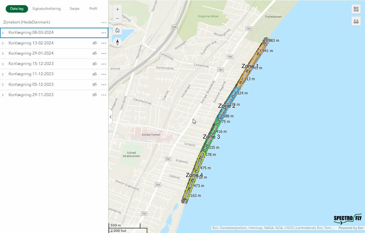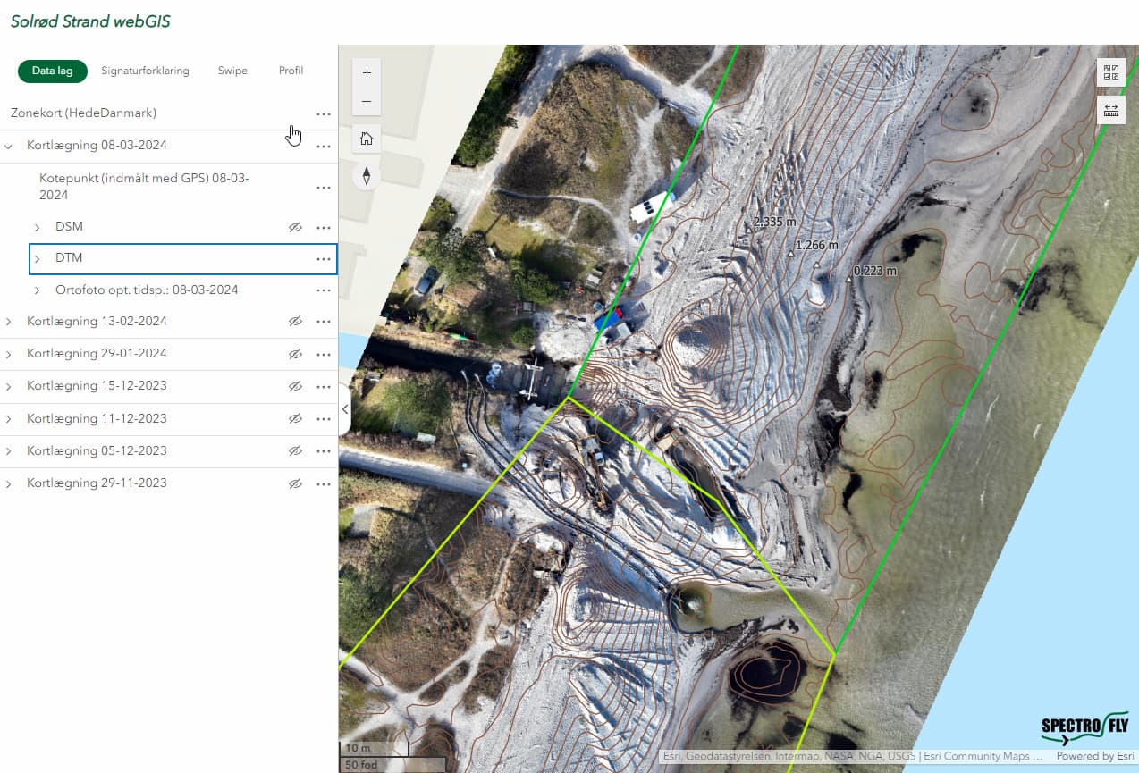SpectroFly bistod med i alt seks droneopmålinger i projektperioden og leverede højopløseligt ortofoto (1,5 cm/pixel) og 3D modeller af ca. 30 ha projektområde, højdekurver og uafhængige kontrolmålinger af terræn.