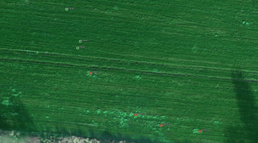 Der ses tydelig forskel på afgrøde (grønne cirkler) og ukrudt (røde cirkler)